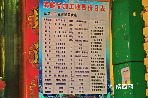 三亚的海鲜加工店,除去一些黑店外,正经店铺的费用收取方式差别不大。加工费一是和海鲜的品种有关,二是和数量有关,三则是和选择的加工方式有关。一些白灼、爆炒、椒盐之类能批量完成的做法,往往按斤两来收费;而比如蒜蓉粉丝蒸扇贝、开边蒜蓉虾等需要厨师一个个海鲜处理加工的做法,就会按个来收取费用。重庆英姐的收费价目表就在店门口张贴着,所以可以根据口味喜好和费用预算来选择最适合自己的加工方式。
